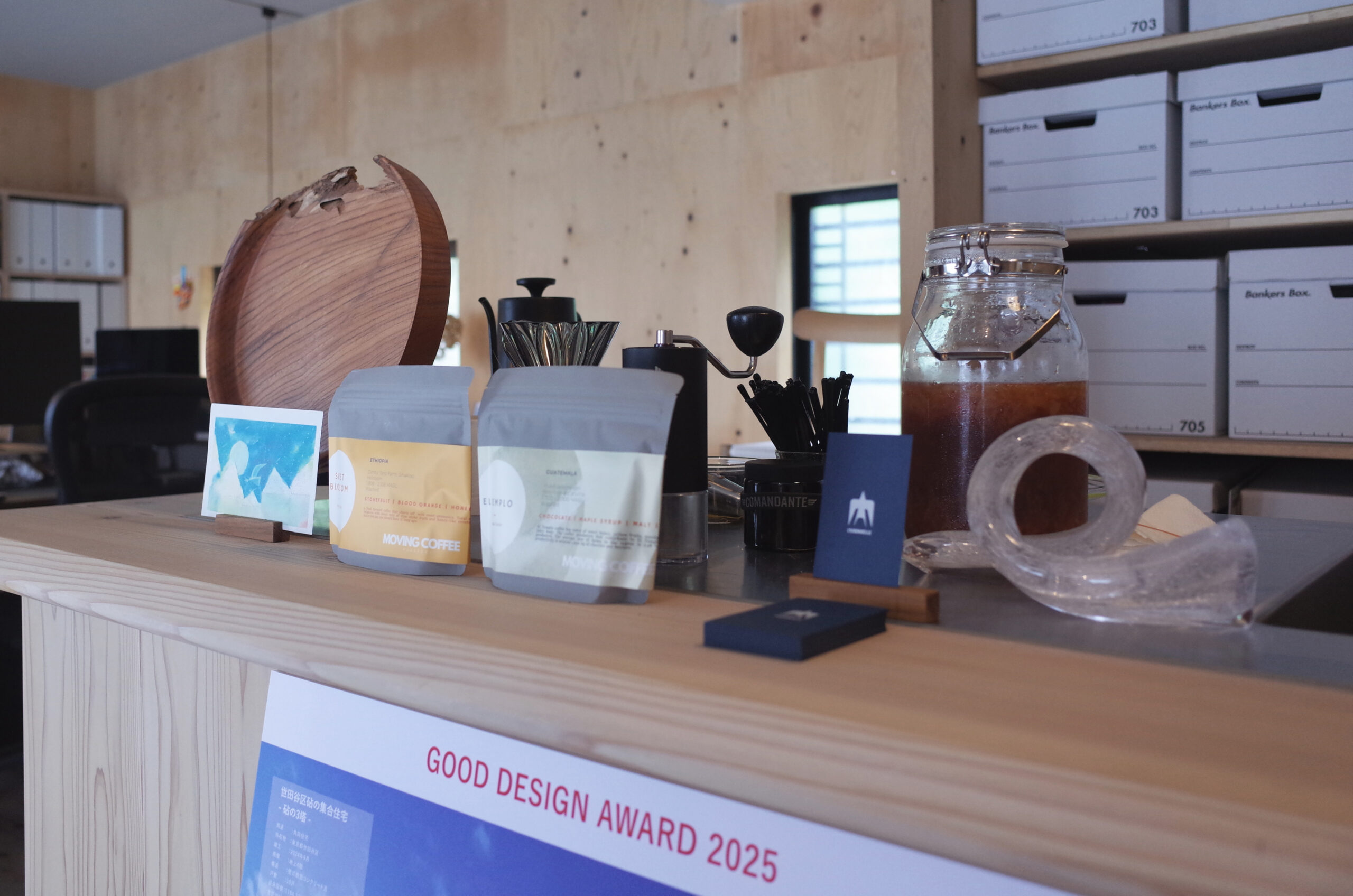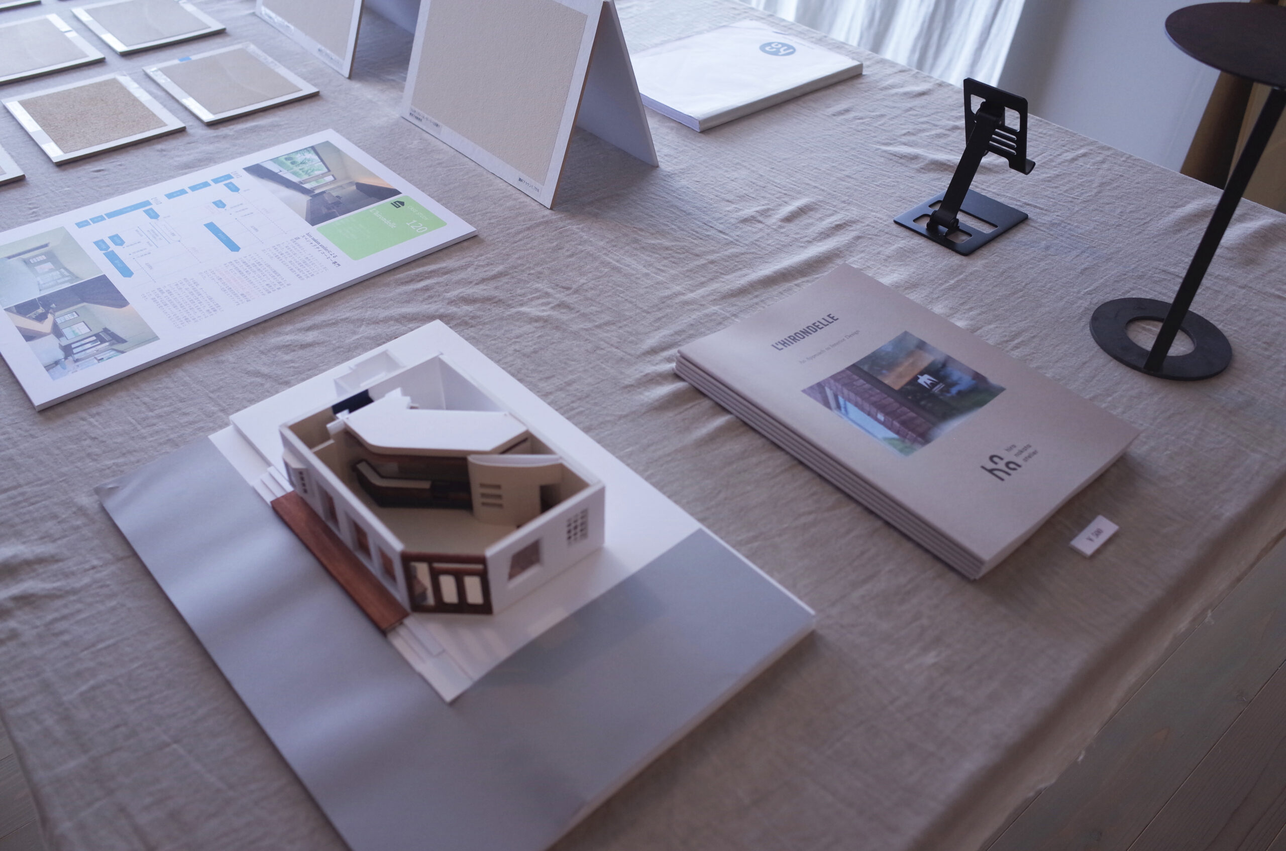 会場では、今年竣工したコーヒースタンド「L’hirondelle(リロンデル)」にまつわる展示をはじめ、 進行中の建築プロジェクトの模型や、鉄・革を用いたクラフト作品などを展示。